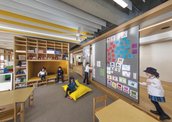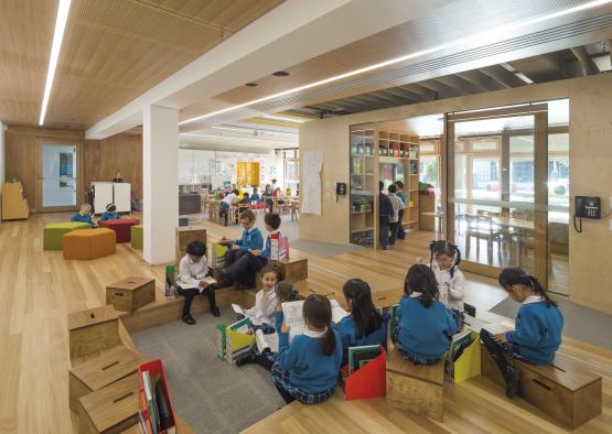 The brief required a variety of differently scaled spaces incorporating technology to suit small children. Movable screens and joinery including shelving, built-in seats and withdrawal spaces enable different teaching configurations. An elevated central spine called the bridge connects the length of the space and provides additional learning spaces. Two small group withdrawal spaces are the only enclosed areas and form a central component of the free-standing joinery elements. Transparent administration areas are visible to the school community. To increase daylight and natural ventilation, the ground floor brick facade was demolished and replaced by high-performance timber-framed double-glazing, with large bi-fold doors opening to the timber deck.