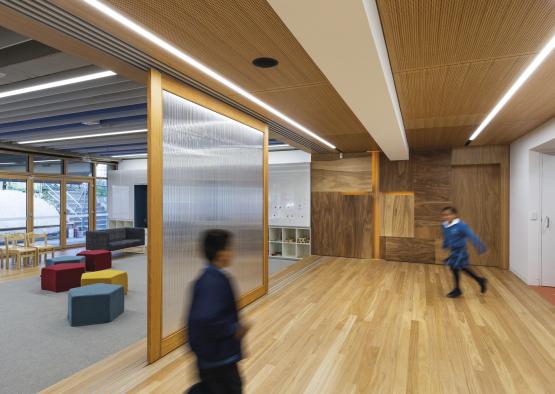 The design approach was to provide flexible, open learning spaces and to create a warm atmosphere. This was achieved through using timber as the main material in floors, wall panelling, ceiling and joinery, timber produces the warm and welcoming environment. Using minimal colour and predominantly timber provided a calm background for learning.