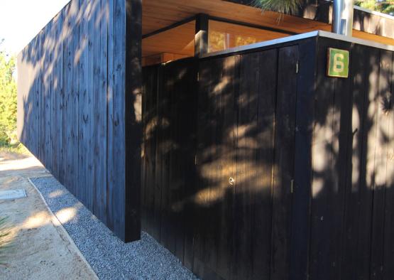 Double timber walls feature on both shared sides of the cabins, acting as further acoustic separation between units. The folded second wall forms a covered walkway and decking area beside the unit, with the warmth of the timber creating a comforting, nestling enclosure that wraps the interior space.