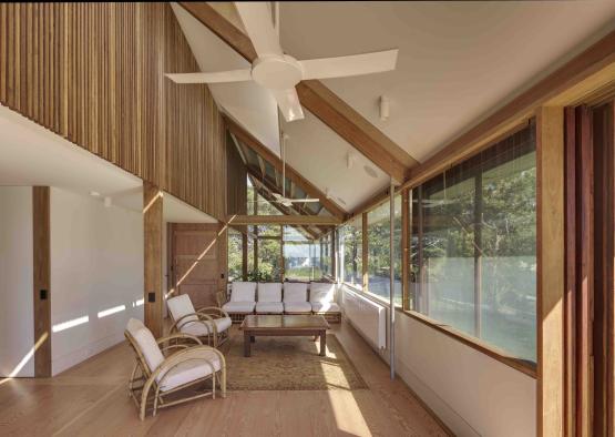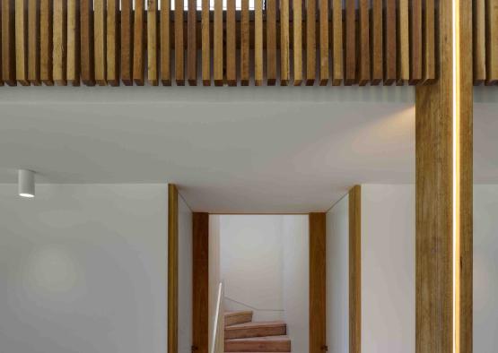 The beauty in each battens irregularity enable the dwelling to nestle comfortably into its site. In front of windows, the cladded screen becomes more transparent, to