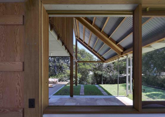 Floors and joinery are recycled Oregon for softness, which welcomes. Doors and windows align with structure.