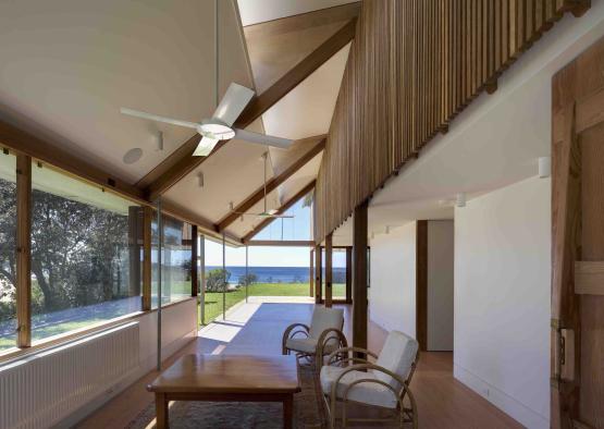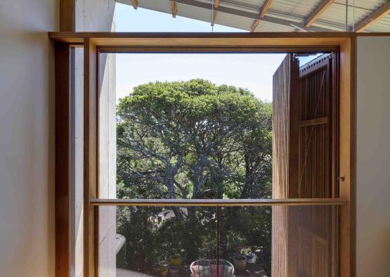 Foredune House engages a raft slab with a recycled timber floor structure overlay at ground level. The concrete slab was rebated at the openings, forming positive weathering thresholds between the interior and exterior spaces while a brass flat saw-cut into the concrete apron allows for the hardwood sliding doors to roll over. The timber floor laid over the raft slab meets the sliding door with a toothed blackbutt interplay, with the openings containing the recycled Oregon floor boards. On the first floor, the same recycled Oregon floor boards are supported by blackbutt framing. The softness and warmth underfoot is unparalleled.