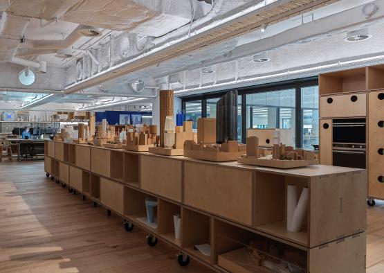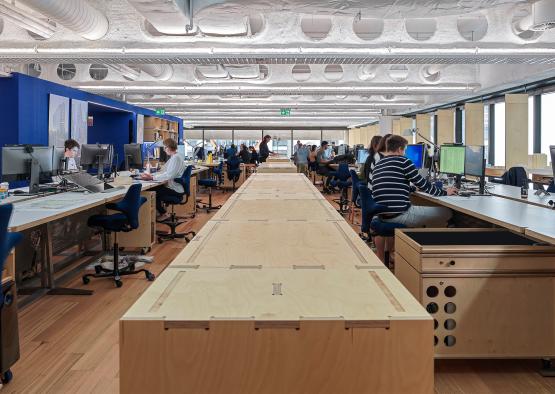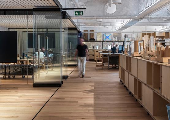 The studio environment unfurls straight out of the lift doors, immediately presenting as a welcoming, informal workspace, buzzing with creation.