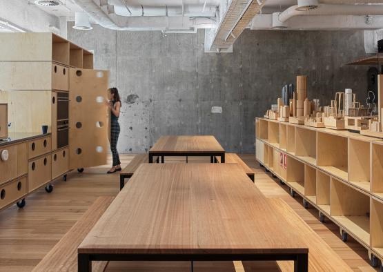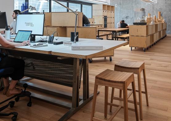 A mixture of F + P designed, as well as custom commissioned tables, benches and stools by Koskella and Simon Ancher Studio were used throughout the studio.