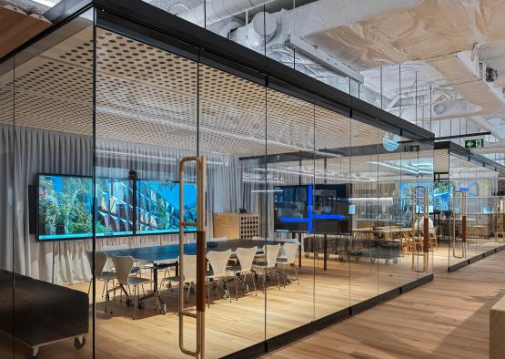 Breakout spaces and closed boardroom areas offset the hard glass walls with perforated plywood ceilings, which diffuse sound. Acoustic detailing is an important consideration in a work environment, which is subject to an array of sound sources. Soft and perforated surfaces can help mitigate sound transfer, creating a more ambient space that is conducive to concentration.