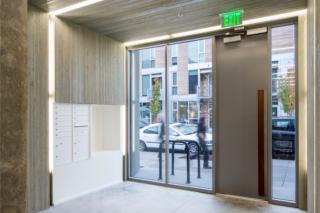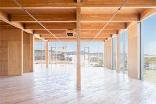 The first floor has a concrete podium (retail, garage and lobby). The upper floors are a mass timber frame with Glulam Beams and columns and 3” tongue + groove sawn wood decking, playfully laid on the diagonal. Plywood shear walls constitute the lateral system and are the only fixed walls in the space.