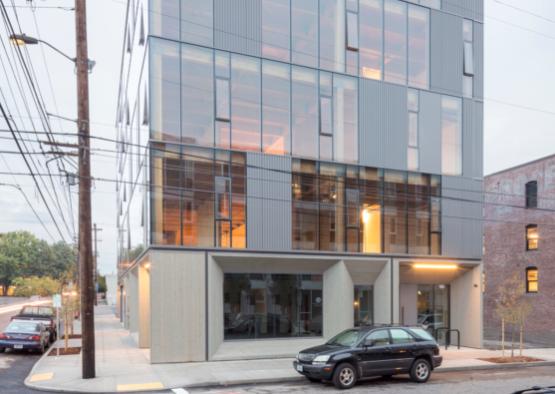 The structure consists of a concrete base with the upper four floors framed in glue-laminated beams, and diagonally laid tongue-and-groove floors and ceilings. Historically this building type would be constructed with thick masonry perimeter walls with relatively small apertures. Inherent in the architecture of adapting this traditional type is how the building’s mass is portrayed. We wanted to allude to this contrast by how the base is constructed, exaggerating the mass, but constructing everything above it of simple wooden boards.