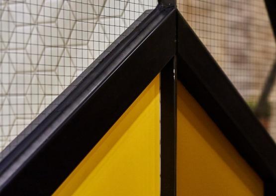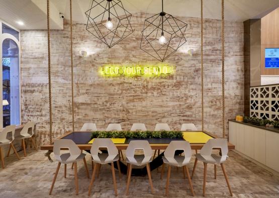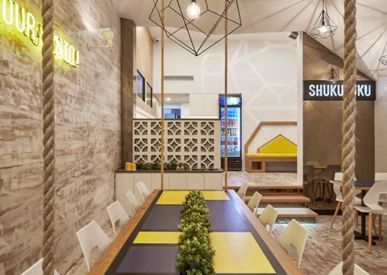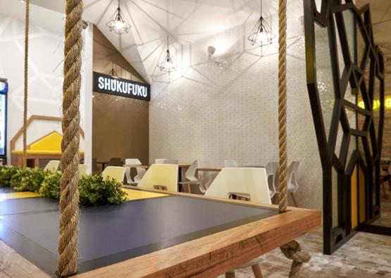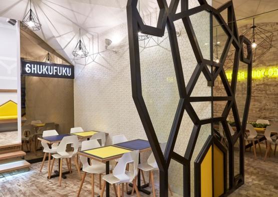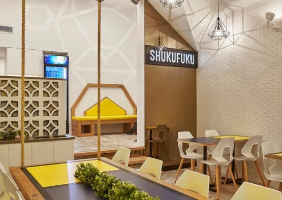 Featuring natural materials such as timber and rope, the neutral toned materials palette is juxtaposed with pops of their corporate colours, blue and yellow. Highlighting Shukufuku's strong brand identity, geometric features were included throughout the interior. From the subtle diamond shaped wall tiles, to the oversized pendant lights; the interior is continually reinforcing the Shukufuku brand identity. The star of the show is the faceted ceiling feature, which is made of over 20 faceted panels. The custom-made individual and communal dining tables feature 'colour blocked' sections which segment the tables, as inspired by the compartmentalised nature of the 'bento'.