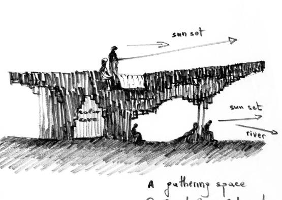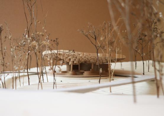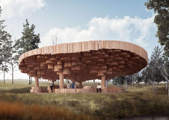 Under the canopy of the pavilion will be a space reminiscent of the cool, dappled shading of a forest. The form is designed to emphasise the magical views of the surrounding landscape, consisting of mountains, creeks, aspen trees and sculptures.