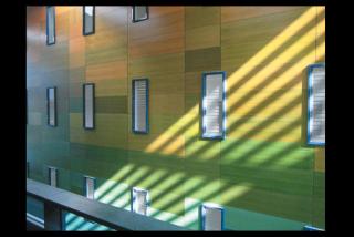 The International Building interior is sheathed in yellow and red tones to reflect the summer and autumn seasons and the Business Building sports blue and green summer/winter hues. The feature panels also harmonise with recycled brick.