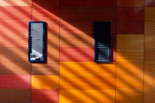 'Light courts' slash through the centre of both buildings - functioning as conduits for air, light and movement of occupants. Victorian ash-veneered plywood feature walls, stained and sealed in vibrant colours, face stacked balconies and their cedar balustrades.