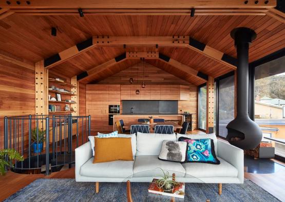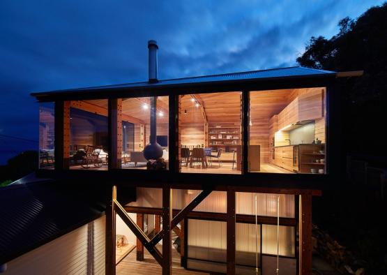 The elevated extension sits on top of a heavy timber structure and comprises a kitchen, dining and living room, accessed via a spiral staircase. Polycarbonate was used as a lightweight cladding to infill the structure below, creating a useable space without adding mass that would dominate the original property. The new living space does not protrude forward over the ridge-line of the old house and avoids dominating the original shack unnecessarily.