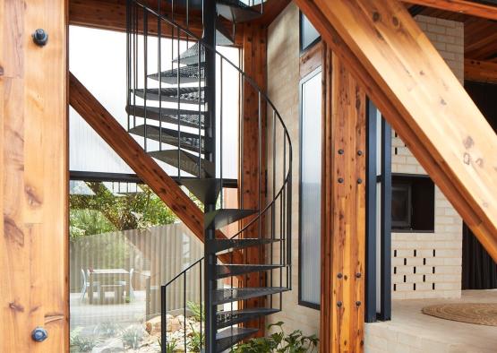 The screening, required in bush fire zones to stop fire embers, acts as a balustrade.