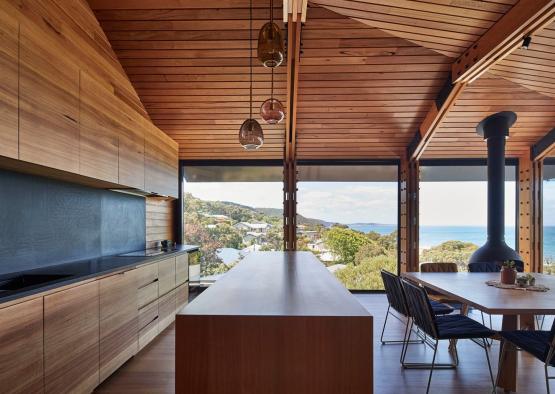 Whilst the old kitchen was transformed into a second bathroom and laundry, the original beach shack remains mostly unchanged. It was tidied up and repainted, so that the charm and character of the post war shack was retained. Internally lined with Silvertop Ash, it’s a space that exudes character and responds to the seasonal changes and hours of the day.  The lighting inside is very evocative, controlled so you can work, or prepare a meal, without flooding the space with light and compromising the view. Full height windows on the northern side of the living space slide open to allow in the sea breezes.