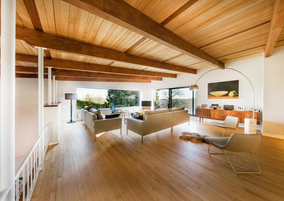 The roof was leaking and barely insulated, meaning that heat loss and gain were a major issue for the clients from one season to the next. However, a prominent design feature of the original house was its exposed timber roof structure and balsawood ceiling. As such, the external felted finish was removed, insulation added and a crisp black zinc roof was added to provide a more durable and contemporary replacement.The existing windows were replaced with new aluminium double glazed units, helping to further improve the thermal performance of the building as there were considerable areas of glazing where heat was being lost.