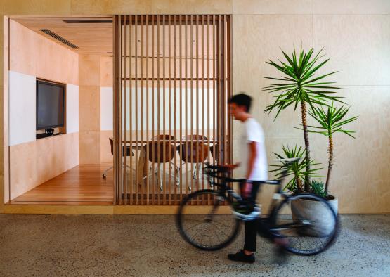 Engineered oak timber flooring has been used for the the built in meeting room spaces, offering a contrast to the polished terrazzo concrete which spreads through the rest of the warehouse space. Victorian ash hardwood was used for timber sliding doors and windows.