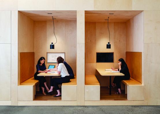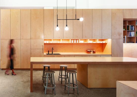 Custom joinery was created to differentiate the various specialist work zones, from private, to more open and collaborative areas. Raw timber, black metal detailing and tan leathers make up the palette of the joinery. Booth seating, a library area, meeting rooms, and a kitchen are all custom made from plywood and solid timber. Birch ply treated with melamine foil was used as the kitchen splashback, maintaining a consistency of materials.  The distinct zones offer different acoustic properties to allow variations in atmosphere for staff. Sliding doors provide an easy solution to adapt the spaces depending on usage.