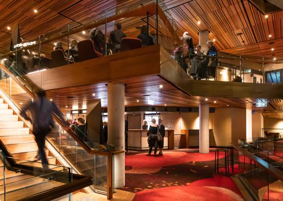 The ceiling of The Hedberg foyer spaces are lined with Tasmanian blackwood veneer. Tasmanian blackwood veneer provides warmth and a sense of place-based identity to the spaces. Blackwood is a slow growing Tasmanian eucalypt. Final harvest of the timber can take more than 50 years, making veneer a more cost effective and sustainable alternative to using solid sections of the timber.