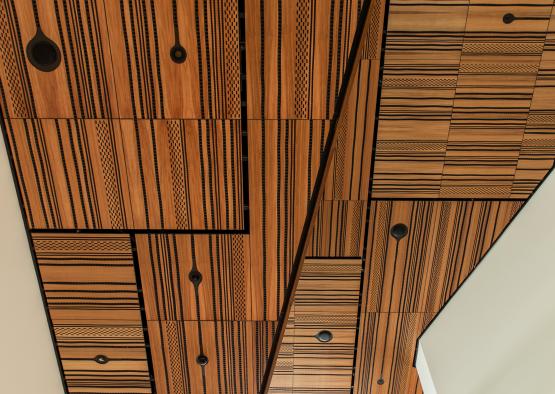 Prototyping was a big part of testing opportunities. The computer routed pattern provides scale to the large volumes of space. The perforations in veneer ceiling panels also provide acoustic absorption, enabling opportunities for performances, events and media activation to plug in and interact vertically across the levels.