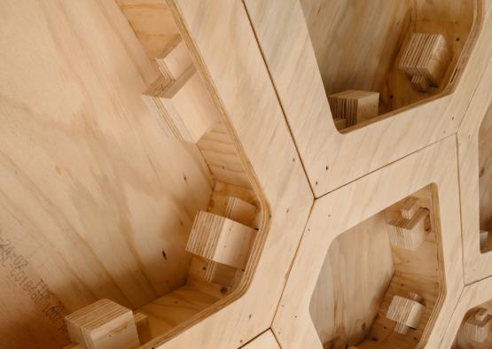 1531 timber segments making up the 201 boxes of the HexBox shell. The shell is made exclusively from plywood components, without the addition of any kind of metal fasteners for the main load-bearing structure. The project references traditional wedge joints, in this case using off cuts of plywood from the main plates, which would otherwise be a waste material. Wedge joints were a smart and common method in traditional handcrafted carpentry and cabinetmaking, and particular popular in Japanese carpentry.