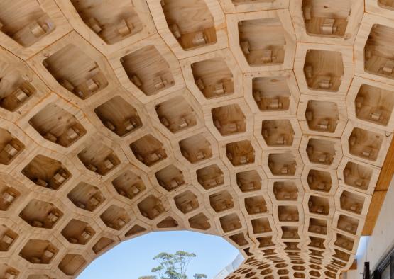 The HexBox Canopy is a prefabricated plywood sunshade that uses cutting edge robotic technology to get the most out of a simple material: Ecoply plywood.