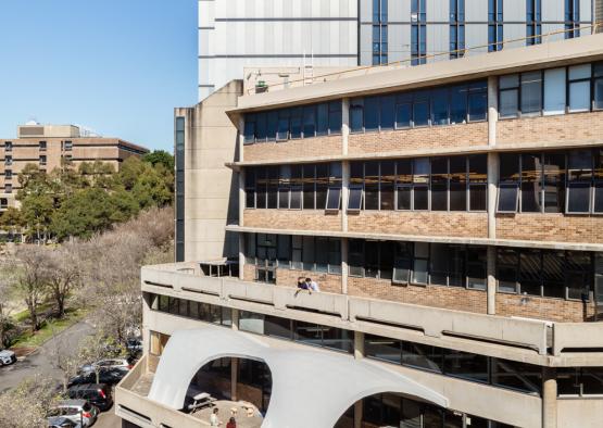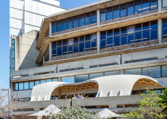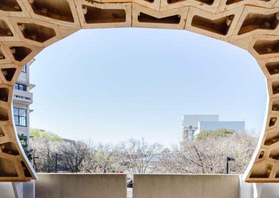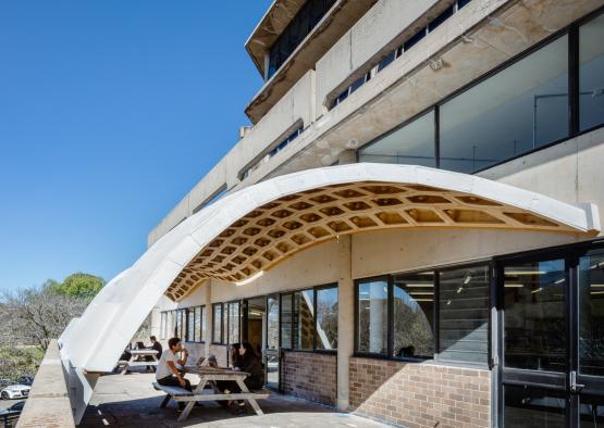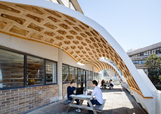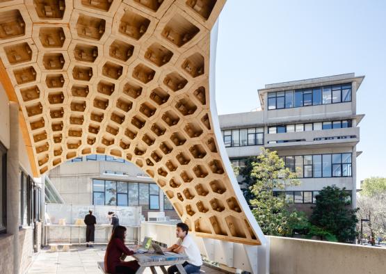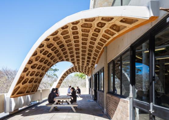 The project is located on the second floor terrace of the Wilkinson Building, at the University of Sydney Darlington campus. The design and fabrication was a collaboration between the University of Sydney School of Architecture and TU Kaiserslautern University in Germany.