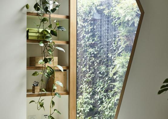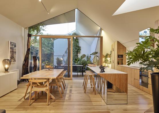 Timber-framed double glazing exposes the expanse of the living area to the courtyard, encouraging outdoor living while responding to climate and context by providing excellent solar access and passive ventilation reducing demands on mechanical heating and cooling.