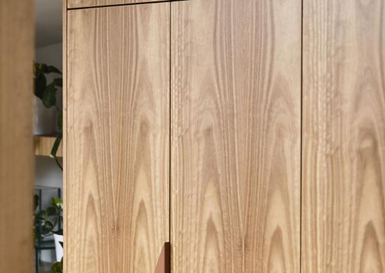 The transitional space between living and sleeping features a generous amount of cabinetry for storage and display. Joinery lines the length of the wall, with a refined palette of timber and tiles providing a layered backdrop for the couples’ combined landscape of artwork, furniture, plants and books. Tasmanian oak veneer was used for the joinery, which is an excellent budget option with an amazing finish.