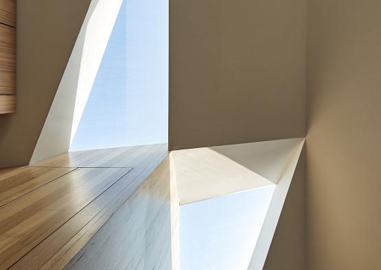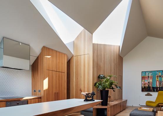 The pitched ceiling gives a grand sense of scale and volume, punctuated by two timber framed triangular skylights, which culminate in the two shapes coming together- referencing the coming together of the clients’ love.