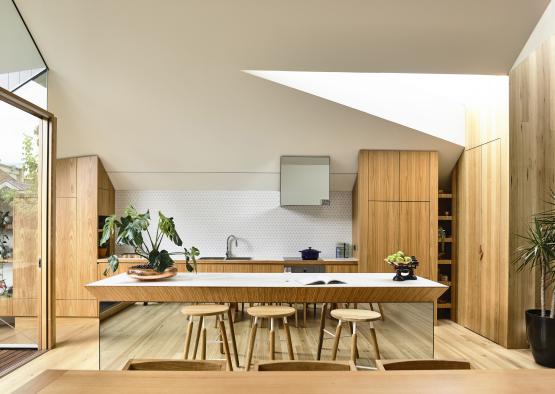 Pragmatically a timber floor system was the logical choice due to ground levels, site access and the rear master suite was to be linked via a ramp. Tasmanian oak tongue and groove flooring was left exposed and oiled to create a rich honey colour.