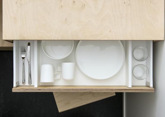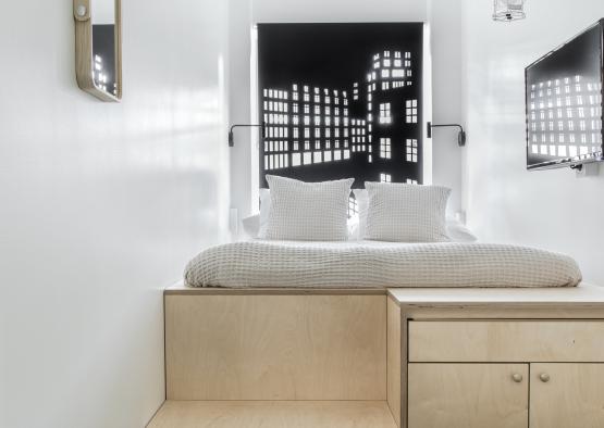 Super compact ‘mini rooms’ line the exterior walls of the building. Plywood beds fill most of the room, taking up the entire width, and raised to the height of the window sill. Each bed system contains a drawer also made from plywood, along with a fridge. The perimeter rooms also house double bed rooms, while further bedrooms and communal spaces operate in the centre of the layout.
