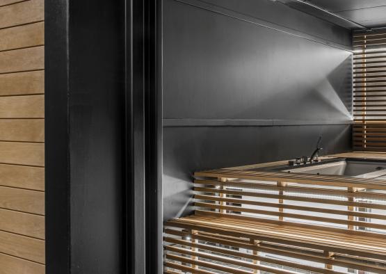The building was previously used as a bank. Preservation of the buildings history was ensured by keeping the reinforced concrete bank vault. The fortress-like basement vault has been given a new function as a jacuzzi section. The dark tiles are contrasted by the the lighter tones of the alder-coated vault, which also houses a sauna and toilet facilities.