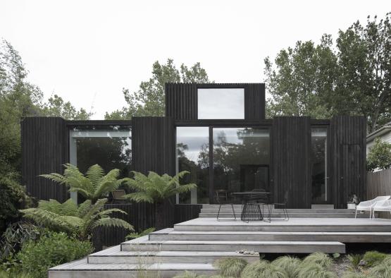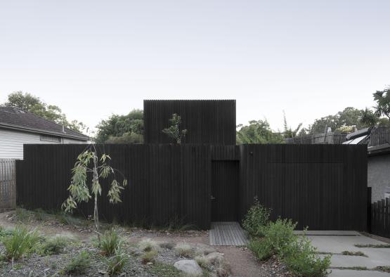 A solid timber massing is the initial presentation of House A to the street. The block form of the house grows out of a sloped site and creates nuance within the single material facade. The dark colour of the timber pops against the greenery of lush Alphington, and the sprouting of ferns from the courtyards behind.