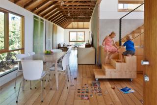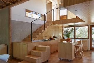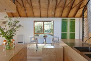 LVL in the roof structure of the reconstructed kiln enabled the cathedral ceiling. The engineered product is also used in the floor of the study, allowing a longer span and a cantilever over the kitchen.