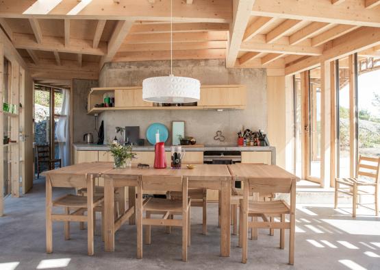 The interior material palette is a celebration of exposed natural material. The concrete floors are bare and rustic, while the mass timber frame remains just as exposed. The lower floors ceiling remain exposed to the joists above, providing a tectonic view of the assembly and construction, and the knots and imperfections in the timber. The simple palette is punctuated by a consistent rap of openings.