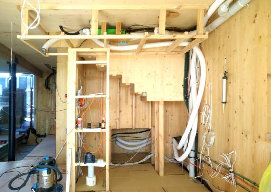 Prefabrication further helped to minimise wastage by optimising panel cuts prior to manufacturing. Offcuts and leftover pieces that would have just gone to waste on site, were utilised to create transport sledges for the CLT, which the architects then carefully de-assembled after transport, and re-used for a suspended ceiling in the hallway to house HRV ducting.