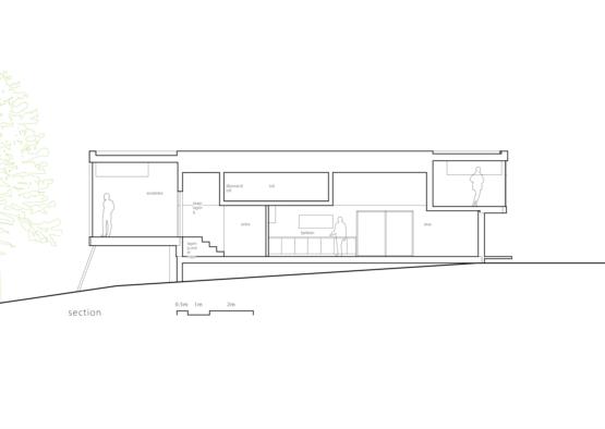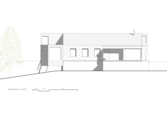 The composition is balanced in two ways. First, the ridge of the gabled roof is skewed towards the annex such that the roof of the annex can be seen as the southern side of a large gabled roof, covering both the main volume and the annex. Secondly, the large window of the top front module serves both as a centre-piece for the composition as a whole and as a dynamic counterpart to the glass corner at ground level to the north-west.