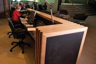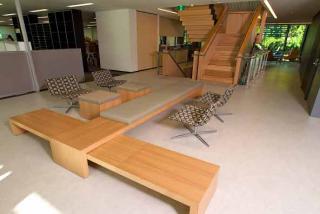 The visual centre of the entrance foyer is a freestanding staircase that travels up the three stories of the building. Timber was the clear preference for the stairs due to the warmth and range of textures that it presents. The designers wanted to express the flights and landings as lightweight elements, and timber was used to conceal the supporting elements as much as possible. Half landings were cantilevered from the central support and flights were suspended from floor slabs rather than propped with columns. Glass was used as balustrades at each floor level to reveal the timber stair.
