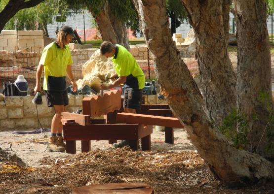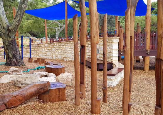 The decision to use Australian hardwoods came down to a mix of strength and the established budget of the park. Jarrah and Tuart timber logs were carved with animals and patterns to create an expressive environment. Timber poles were used structurally for equipment and shading, and dressed timber for the decking and seating. Hardwood mulch was also spread throughout the park to create organic garden beds.