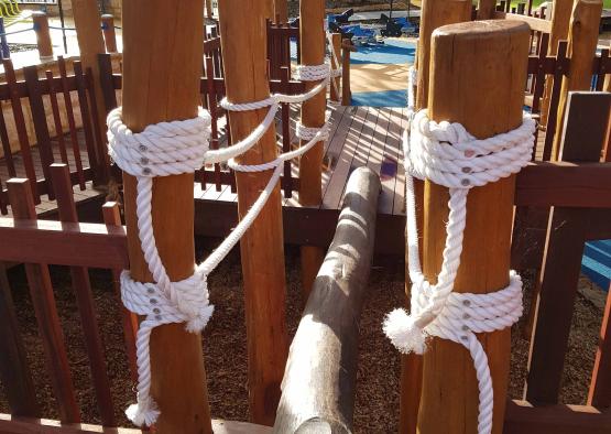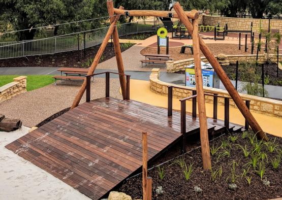 Decks, poles, balustrades, seats and play equipment all utilise timber design, balancing artistic form with durability and an organic aesthetic. Timber was an essential component in achieving a welcoming and tactile environment for children and adults to relax, play, and learn. Particularly within the disability sector, warm and tactile materials are essential. Timber is much more engaging and pleasing to touch than steel or plastics.