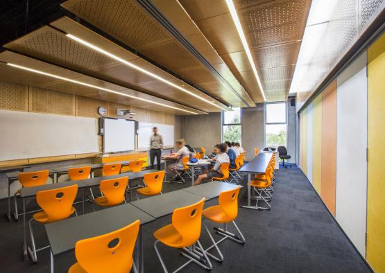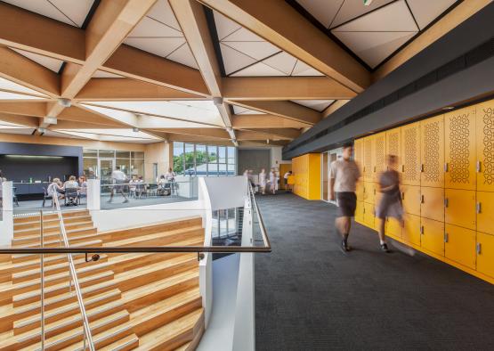 Gen‐Eco Purebond Plywood Grade-A Rotary Sap Maple Face was utilised for multiple applications within the project. Firstly, the application of the material was used to clad the exposed LVL ceiling structural framework to give the appearance of solid timber beams. It was also utilised as wall and ceiling panelling which provides a “contemporary” look, creating a space that promotes the health and happiness of the students with the warm cream and brown surfaces of the Sap Maple Face plywood. This created an environment that is nurturing, lessens distractions, and encourages participation. The material was also utilised for the cabinetry, particularly the student lockers, which provide a fresh and clean look, contributing to an interior environment that enhances learning.