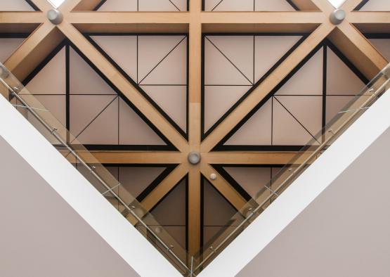 The ceiling of double height free‐spans across the space, utilising deep high span LVL structural timber beams arranged in a triangular fashion. High level skylights positioned within the triangular framework of the timber ceiling enable light to flood into the volume space below. The overall building form is orientated opening up towards a northern axis to maximise the benefits of passive solar design.