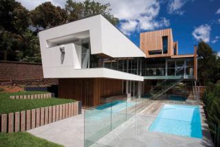 To the rear of the property the upper storey becomes a tree house juxtaposed with an exotec clad form. This shape is injected with a timber battened eave lining to accentuate the diminishing angle that directs your attention to the pool and outdoor spaces.