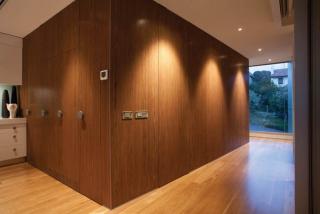 On entering the home you are met with floor to ceiling veneer panels with a vertical timber grain that makes them appear like the base of a huge tree. The panels wrap an interactive core that houses the cloak, powder room, cellar and integrated kitchen wall. The illusion is maintained by the use of pivot-hinged panels that close with a magnetic catch, eliminating the recognizable characteristics of a traditional door.