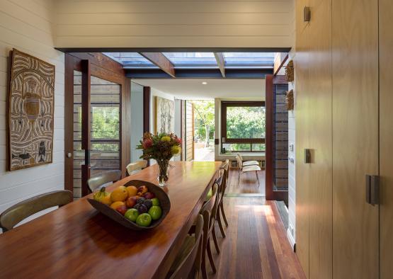 A custom river red gum sliding window creates external flow through the feature bay window near the entrance.