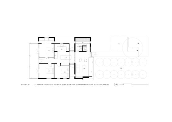 The existing orchard on the property was celebrated in the new design, becoming a core focus of the living and communal spaces in the new house. An restored workers bench from the cottage was the main focal point inside the house, forging a circulation path around it.