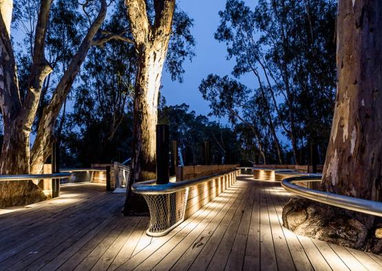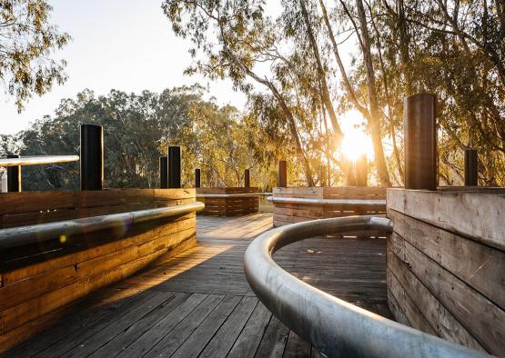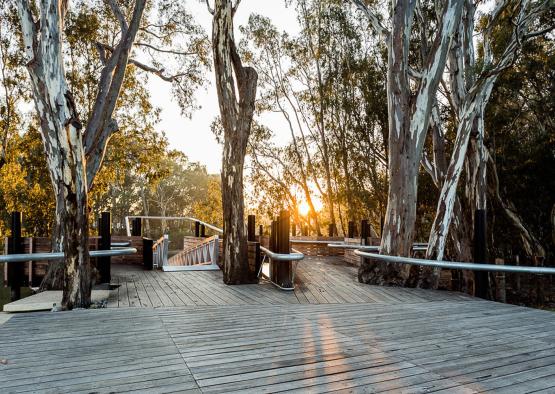 Four platforms, made from local red gum timber, meander through the existing red gums and minimise the loss of vegetation.