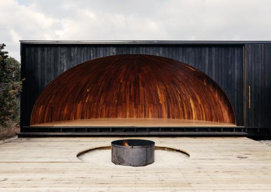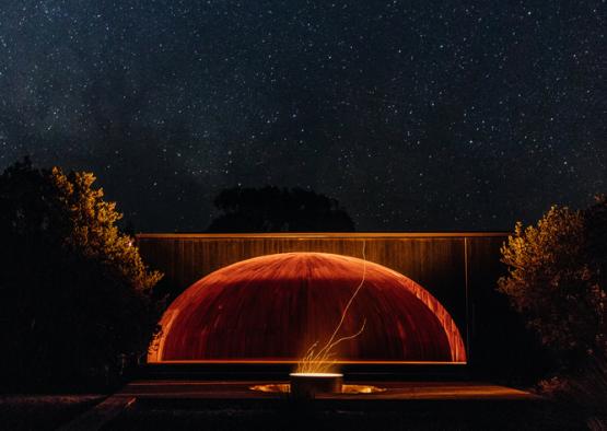 The unusual dome appearance of Krakani Lumi is revealed once the charred facade door is opened. The domed form references indigenous huts of Tasmania’s first peoples. Historical sketches like those of Captain George Tobin, reveal dome like indigenous huts along the coast of Australia. Traditional half-dome huts depicted circular motifs, referencing constellations and representing the form of space above. Krakani Lumi updates the typology into a modern refuge.