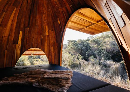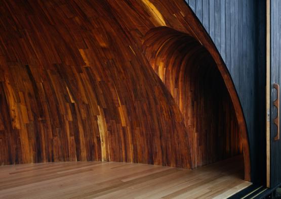 The interior of the main dome has been lined with Tasmanian blackwood. Traditionally, native huts were lined with paperpark and clad in rough bark shingles.