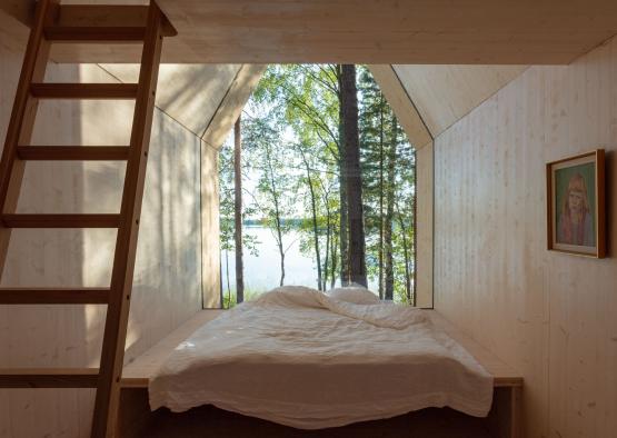 All furnishings, storage areas and shelving is made from prefabricated CLT elements that were installed on the same day as the cabin itself. The result is an extremely calm, considered, and meditative space.